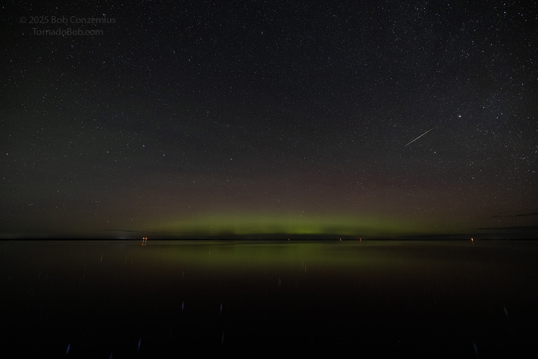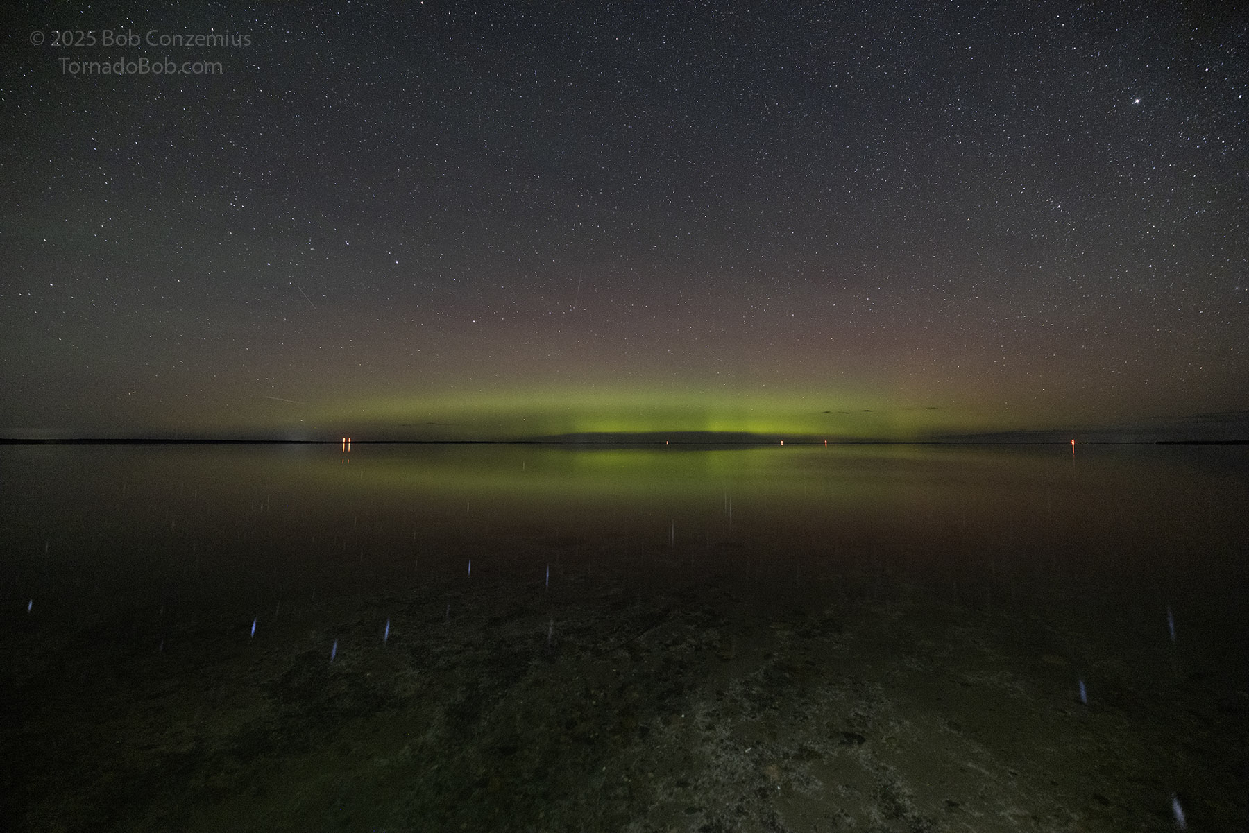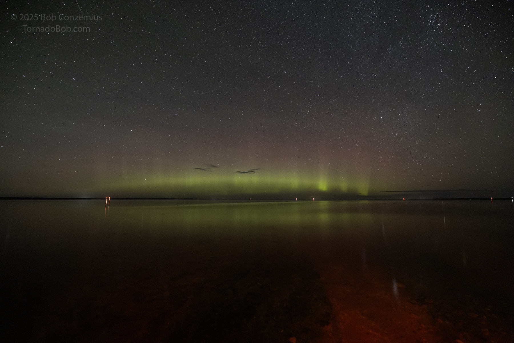 With calm winds (terrestrial, not solar), southward Bz, and clear skies, I decided to drive to Lake Winnie to catch some auroras low on the horizon.