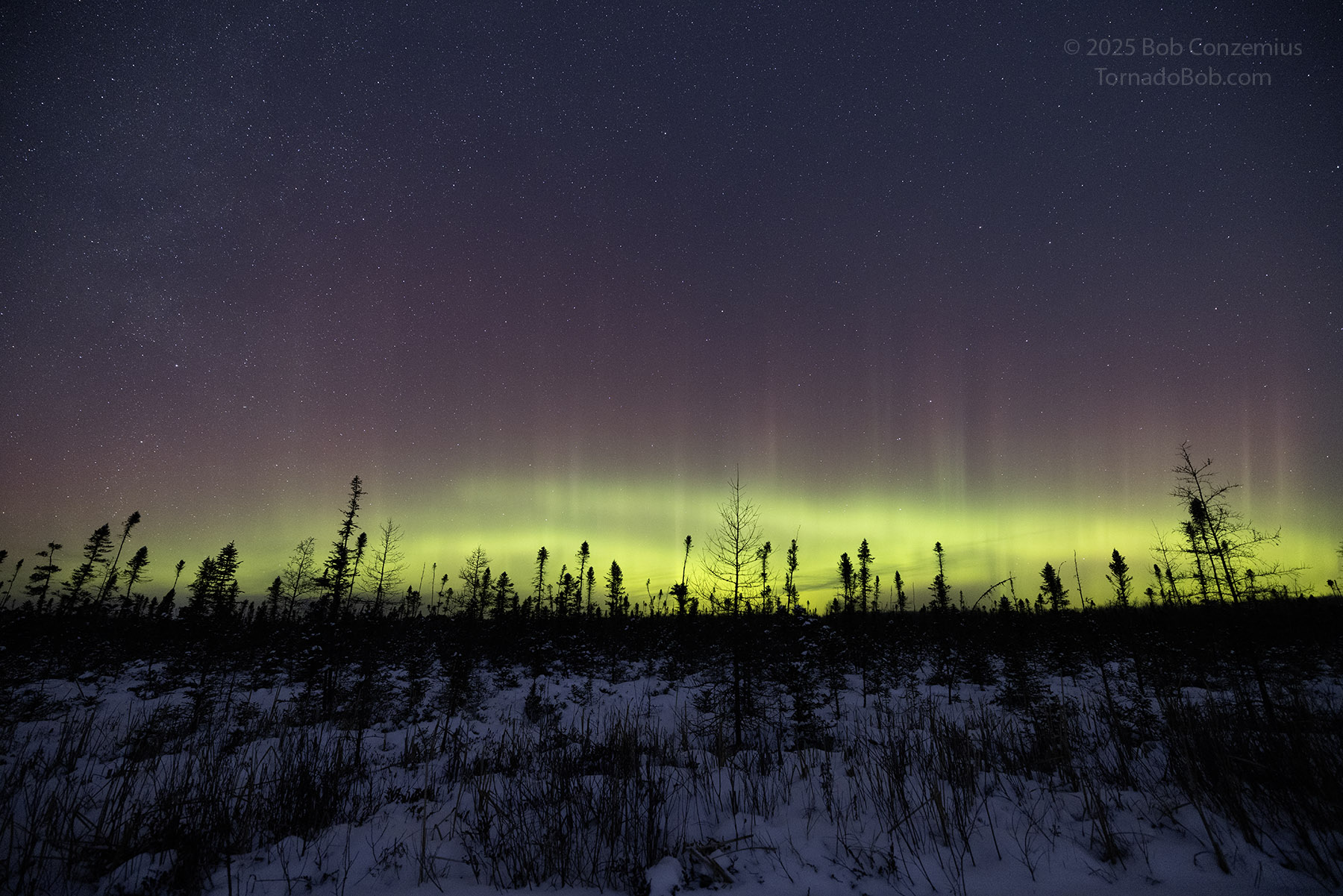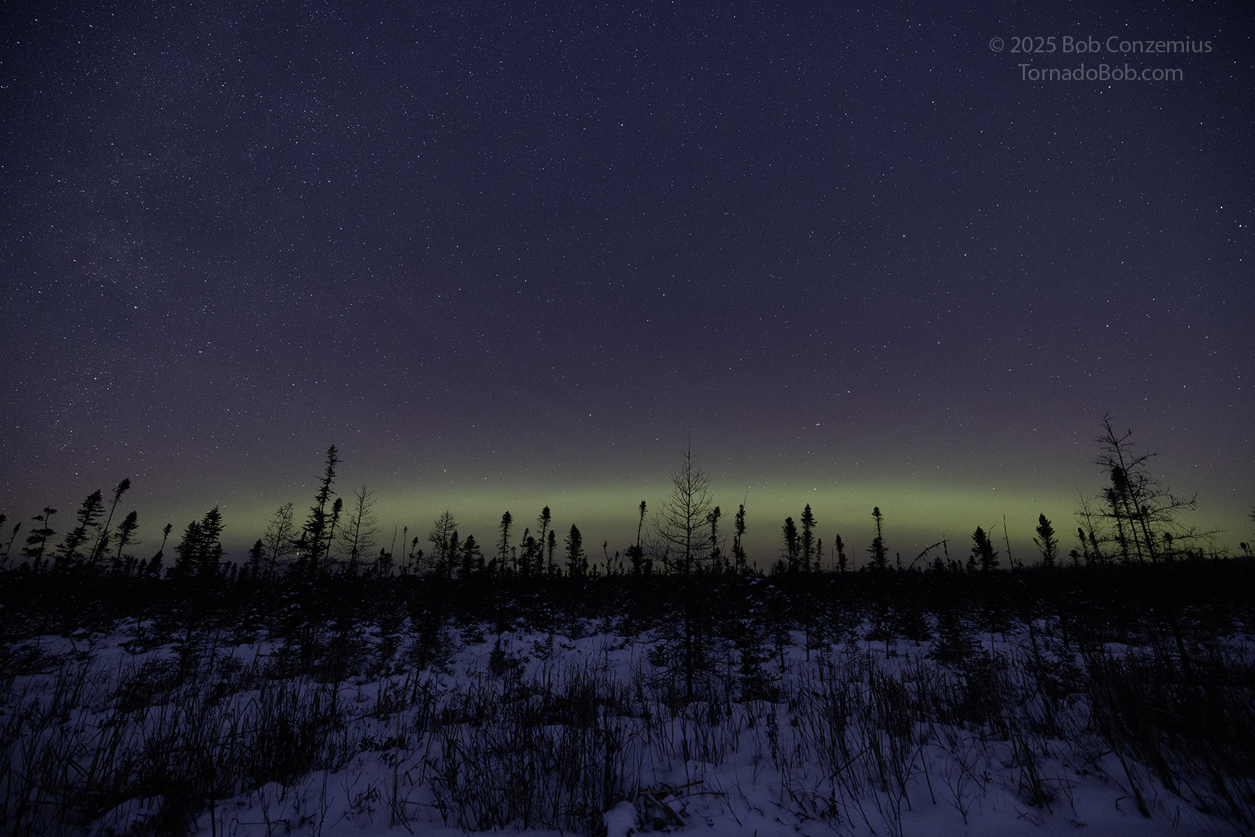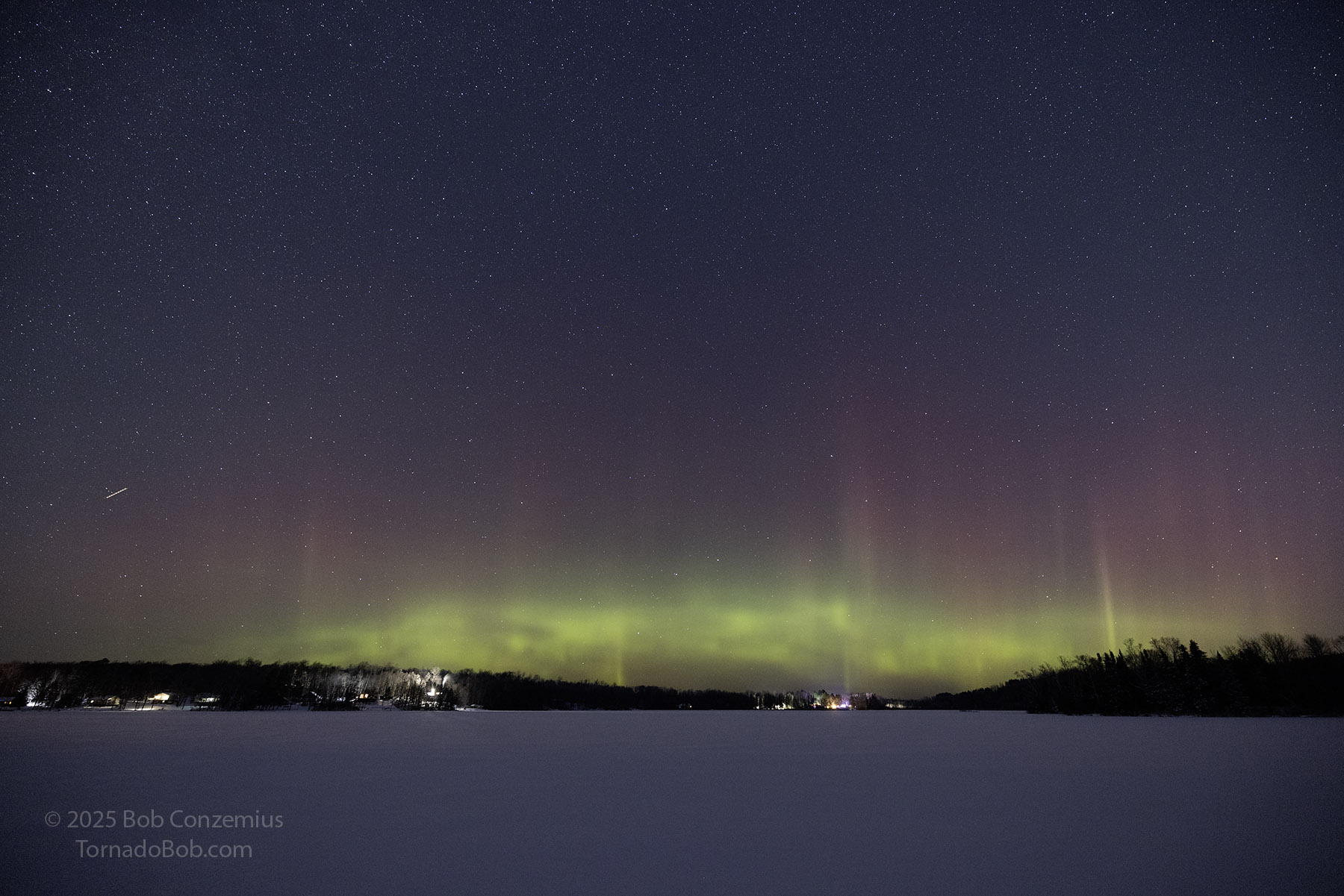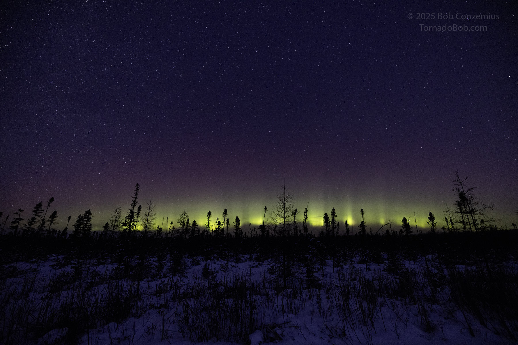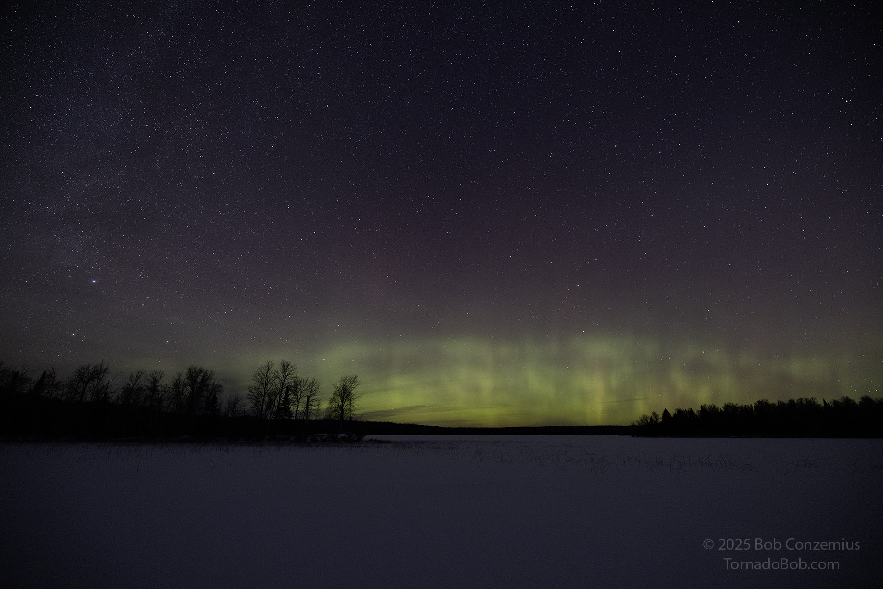 As the show was continuing, the temptation to drive up to Wabana Lake overwhelmed me. Ideally, this would have been the best place to shoot this show because of its proximity to the horizon, but I was worried the show might start before I got there (I was correct-- it did start before I would have gotten there). However, now that I knew I would not miss the show, and thinking of the small chance that another one could quickly follow (this happens only in about one out of five or ten substorms), I drove up to Wabana and walked out onto the lake. The second substorm did not follow, but I enjoyed being out on this lake for what was probably my earliest outing at this location in the winter season. Usually, I'm not out there until at least January because December auroras are the rarest in Minnesota. This December, I've seen them three times already-- that's the most of any December since I've kept track.