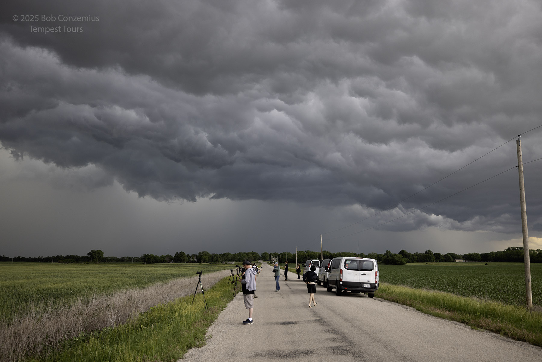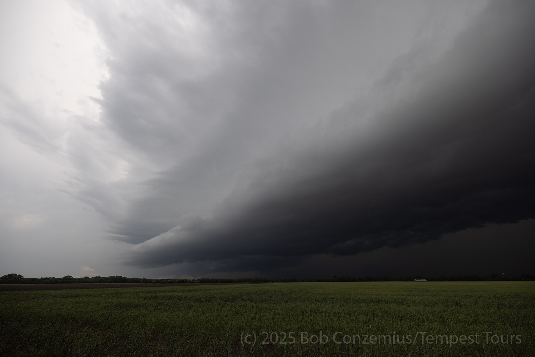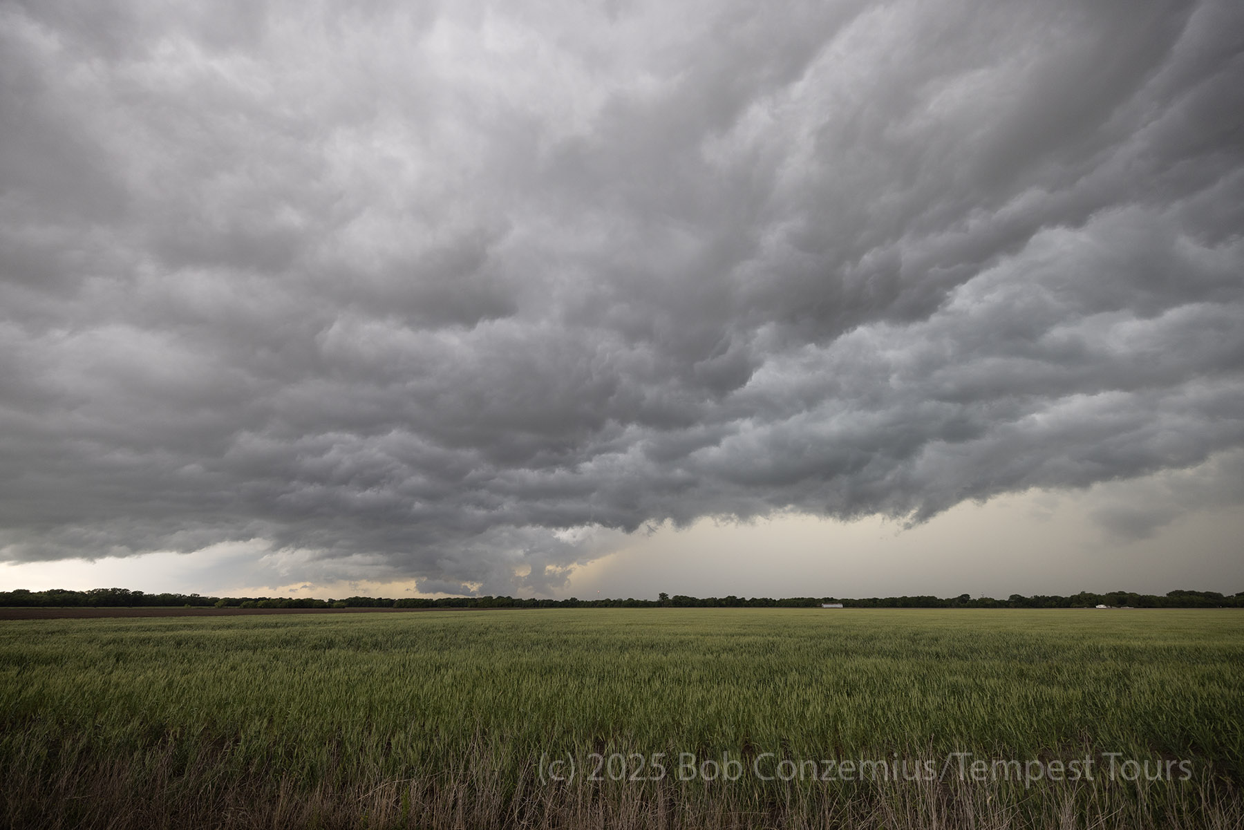 Eventually, it became clear that tornadoes in southeastern Kansas would not likely occur. There were no storms in our area, so we needed to find another target. A line of storms was developing west of the Kansas Turnpike between Wichita and Topeka. These looked like they would be outflow-dominant, but seeing linear storms would be better than seeing nothing, so we got on the Kansas Turnpike and headed toward Emporia. There, we exited and drove west on U.S. Highway 50. We quickly ran into the line and set up to take pictures. We were greeted by a nice shelf cloud and were able to spend about 15 minutes or so taking pictures as it approached. We stayed to get the whale's mouth view of the underside of the shelf cloud, and then we drove back east.