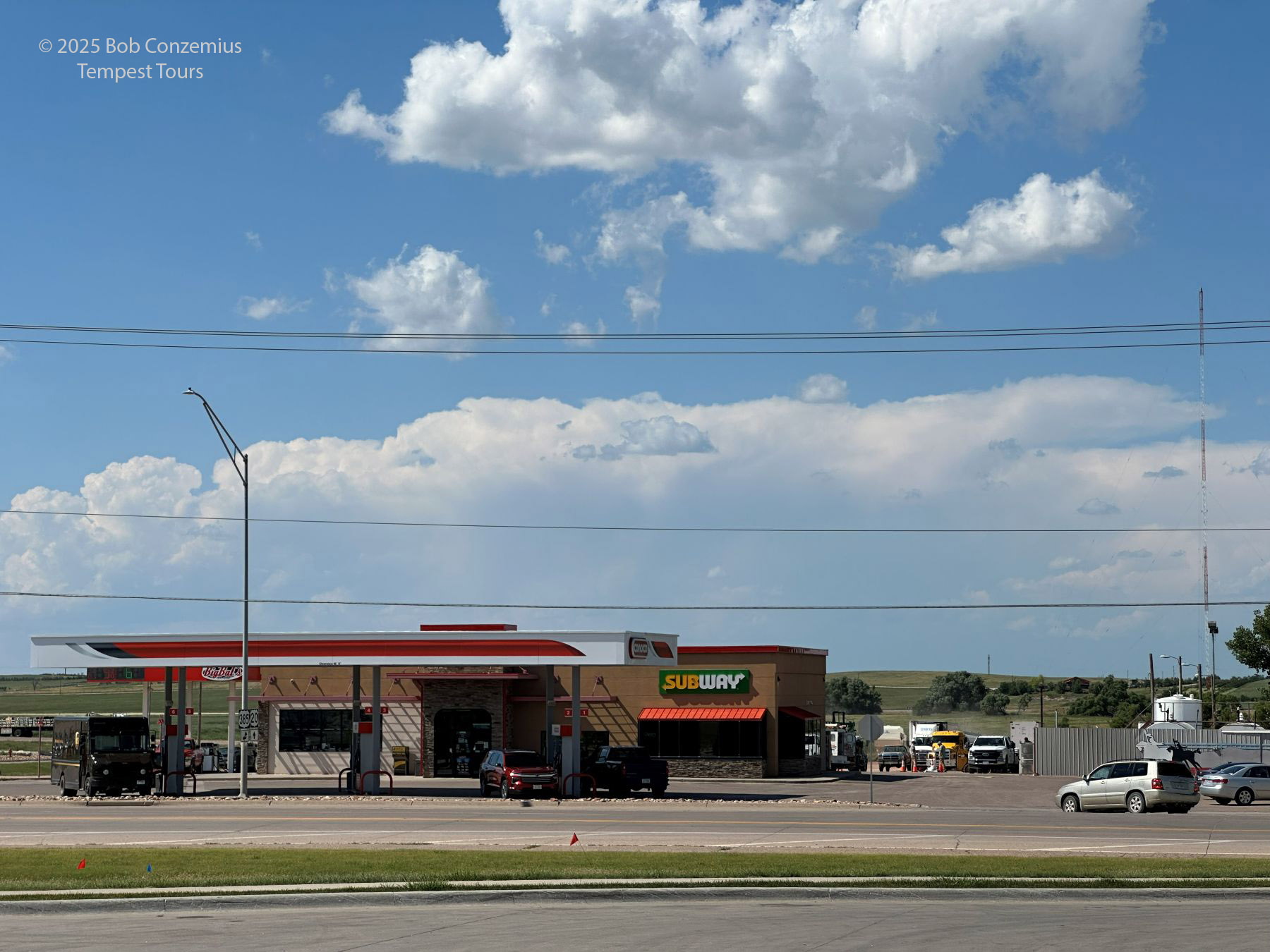 When we finished our museum visits, there still weren't any clear targets. There were some cumulus south of town, but there were also some to the north, and there were storms developing over the Black Hills (the last of these is a nearly certain bet in the summer). We drifted north in search of something that would develop into a storm, and we quickly found ourselved back in Chadron, where we had been a couple days earlier. The towering cumulus in Chadron were bigger than those farther south, but they didn't look very menacing, so we just elected to head toward the Black Hills and wait for one of those storms to come out onto the plains.