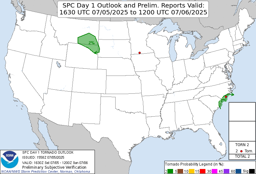 | Storm Prediction Center 1630 UTC Day 1 tornado outlook with verification. |