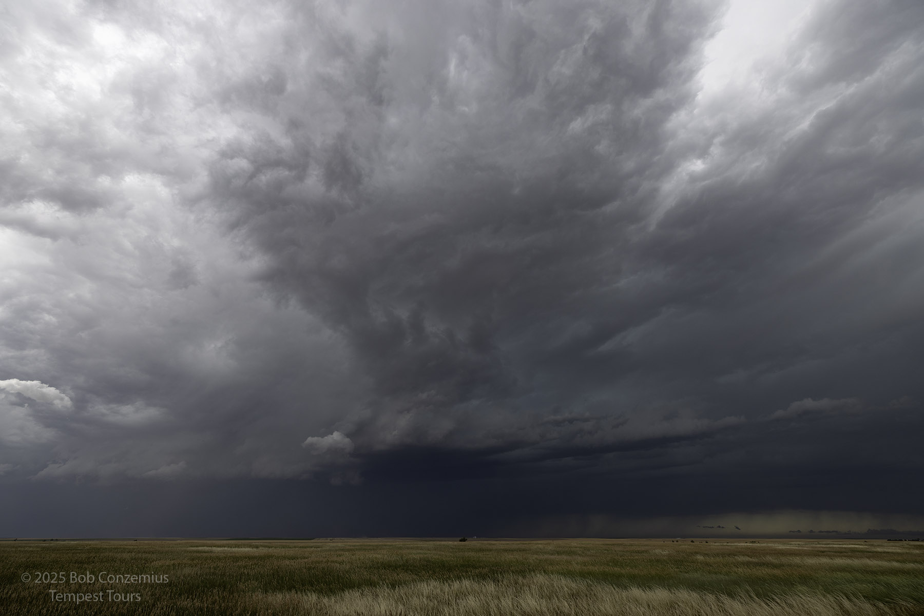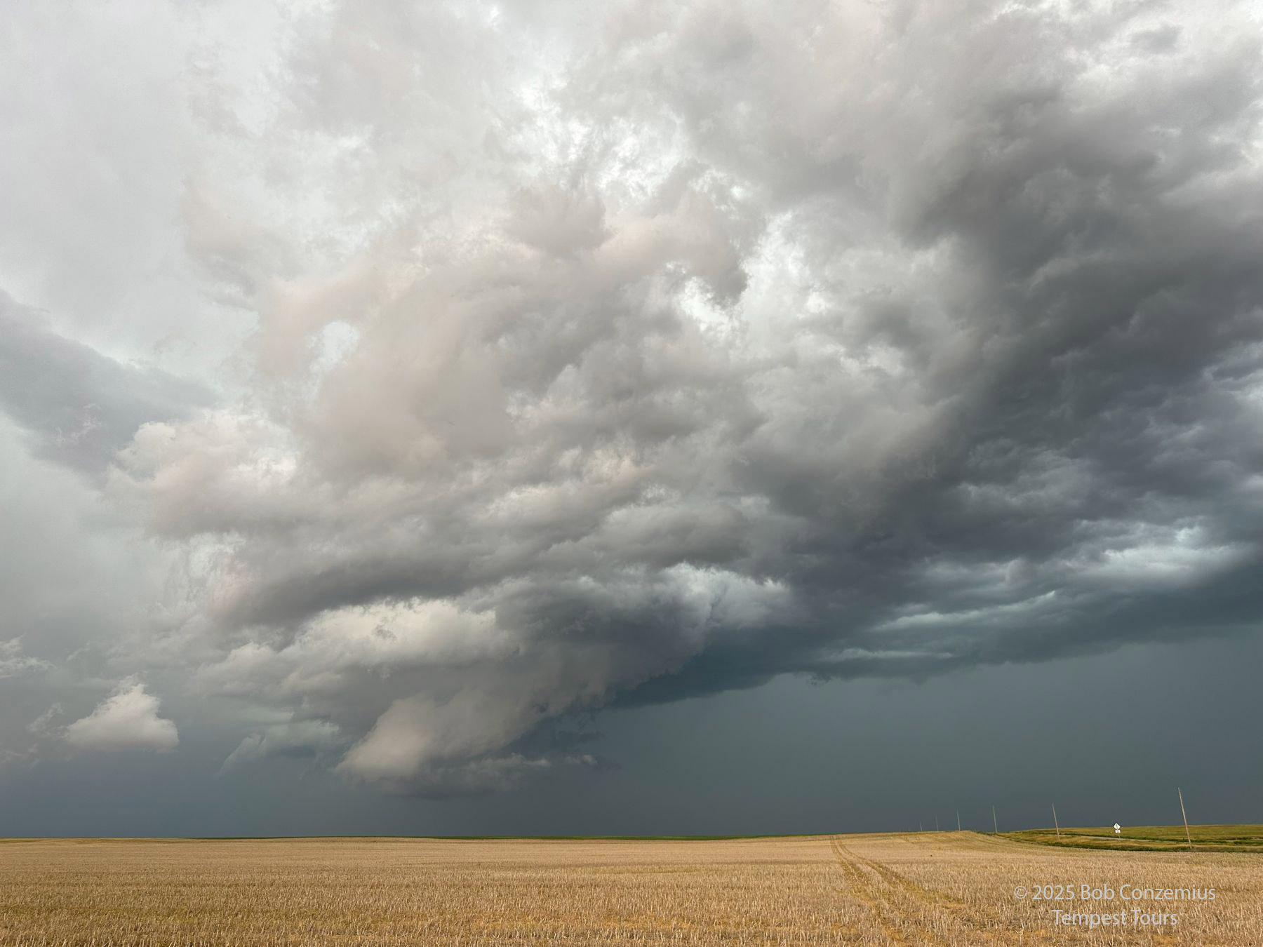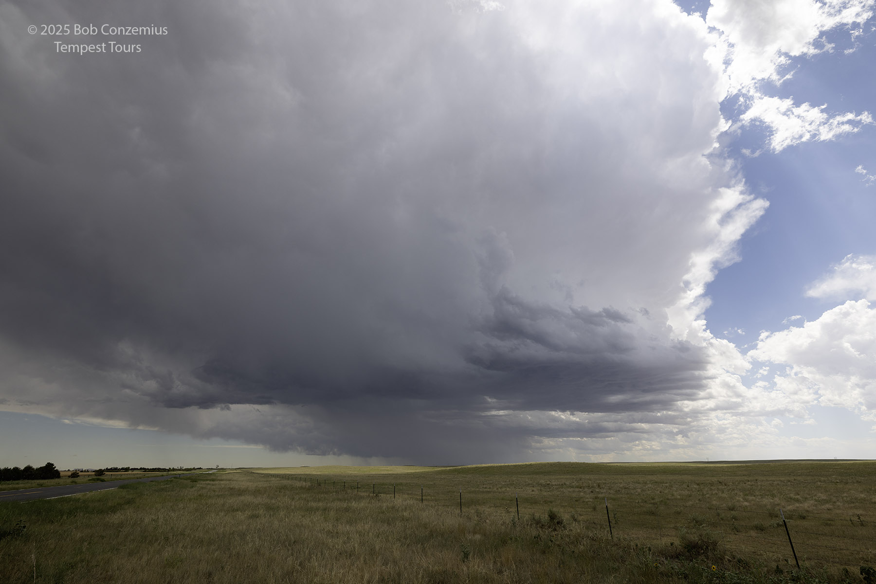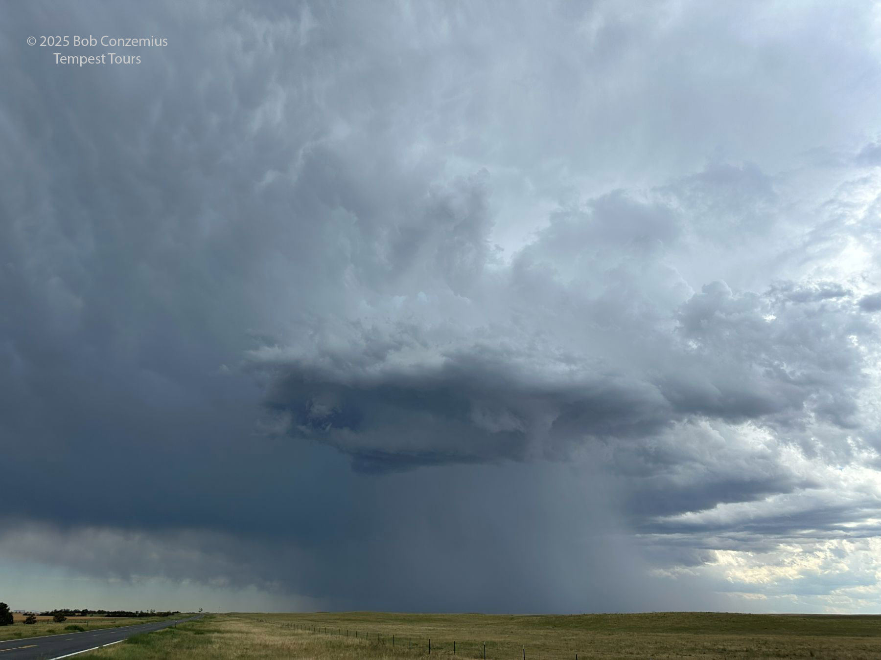 We came around the south side of the storm and got to view its inflow a bit. The RFD side of the storm had a bunch of dust, obscuring visibility into the low levels of the storm. To get a better view, we kept going east, and we eventually reached Colorado Highway 59 south of Haxtun. By this time, the cell was looking less organized, so we targeted some newer storms to our south.