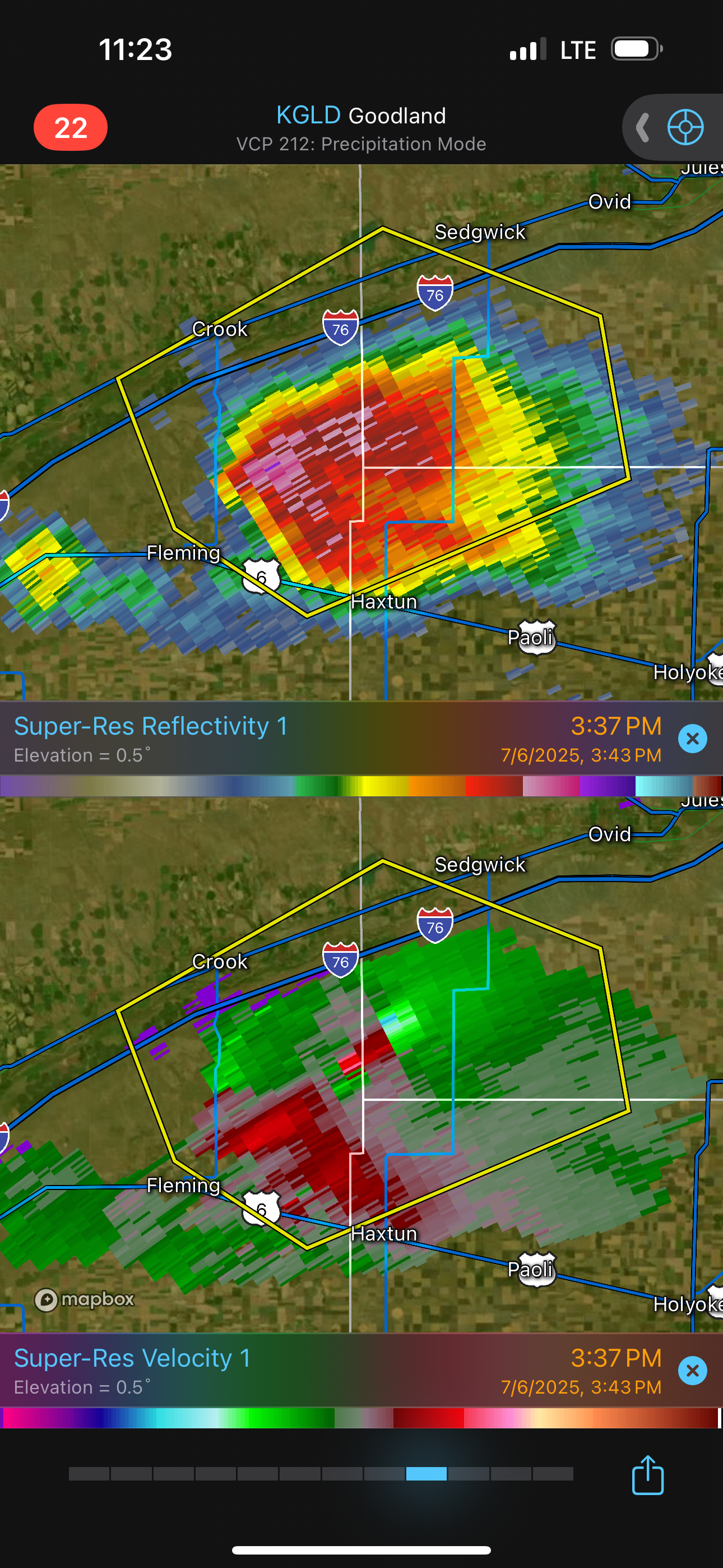 | Radar loop showing anticyclonic rotation in many of the storms. The storm we had just seen at Brush is tornado-warned. |