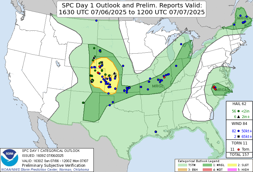 | Storm Prediction Center 1630 UTC Day 1 convective outlook with verification. |
