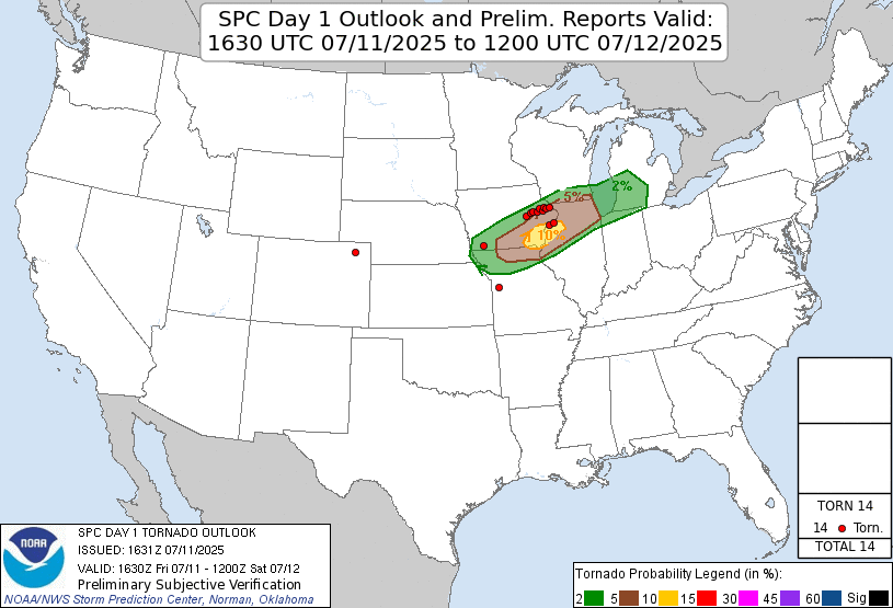 | Storm Prediction Center 1630 UTC Day 1 tornado outlook with verification. |