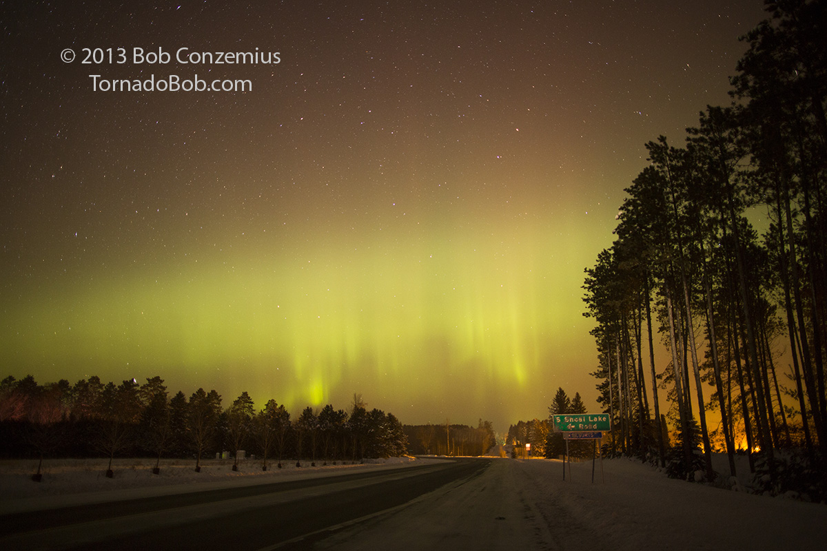 Just before 11:00, the green band of auroras grew higher above the northern horizon, and it looked like a substorm would be underway soon, so I picked that time to leave. I drove north on Highway 38, unsure of my shooting location. When I got to Gunn Park north of town, the substorm started, so I stopped to take a photo.