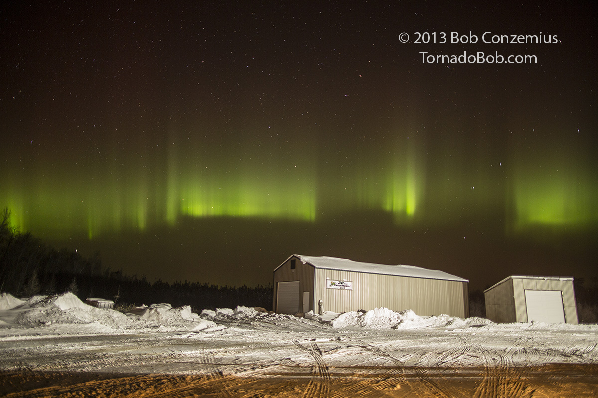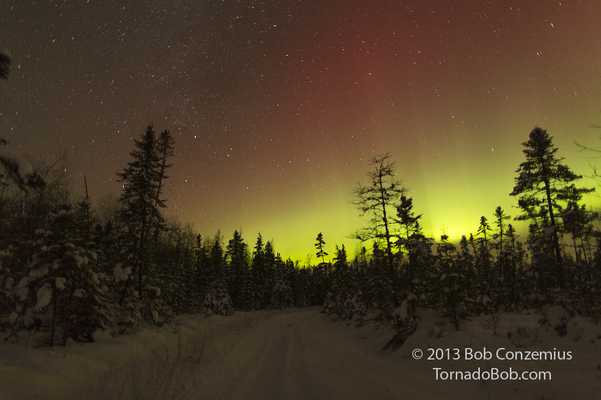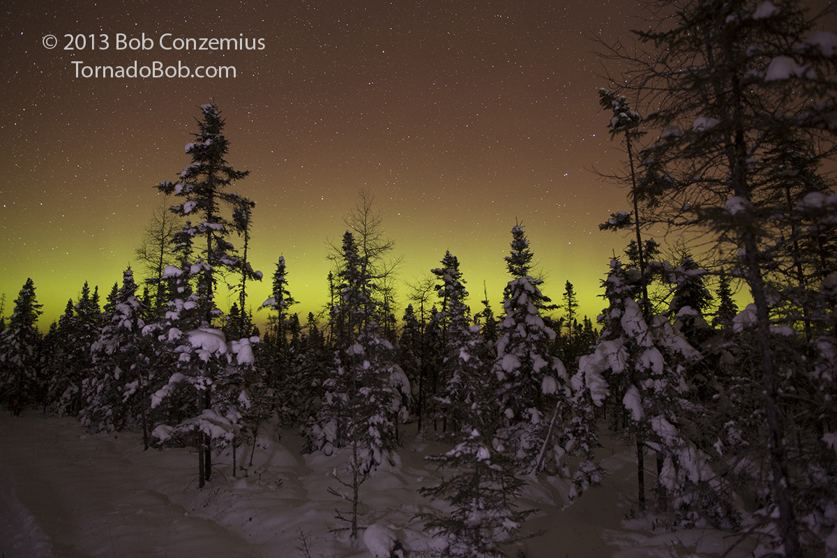 I walked past the buildings, on the snowmobile trail, into the bog and started taking a bit more time setting up the right shots. The trail had not been groomed yet, and there were really no riders out, so it was very quiet. The substorm was starting to subside a little.