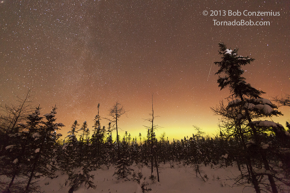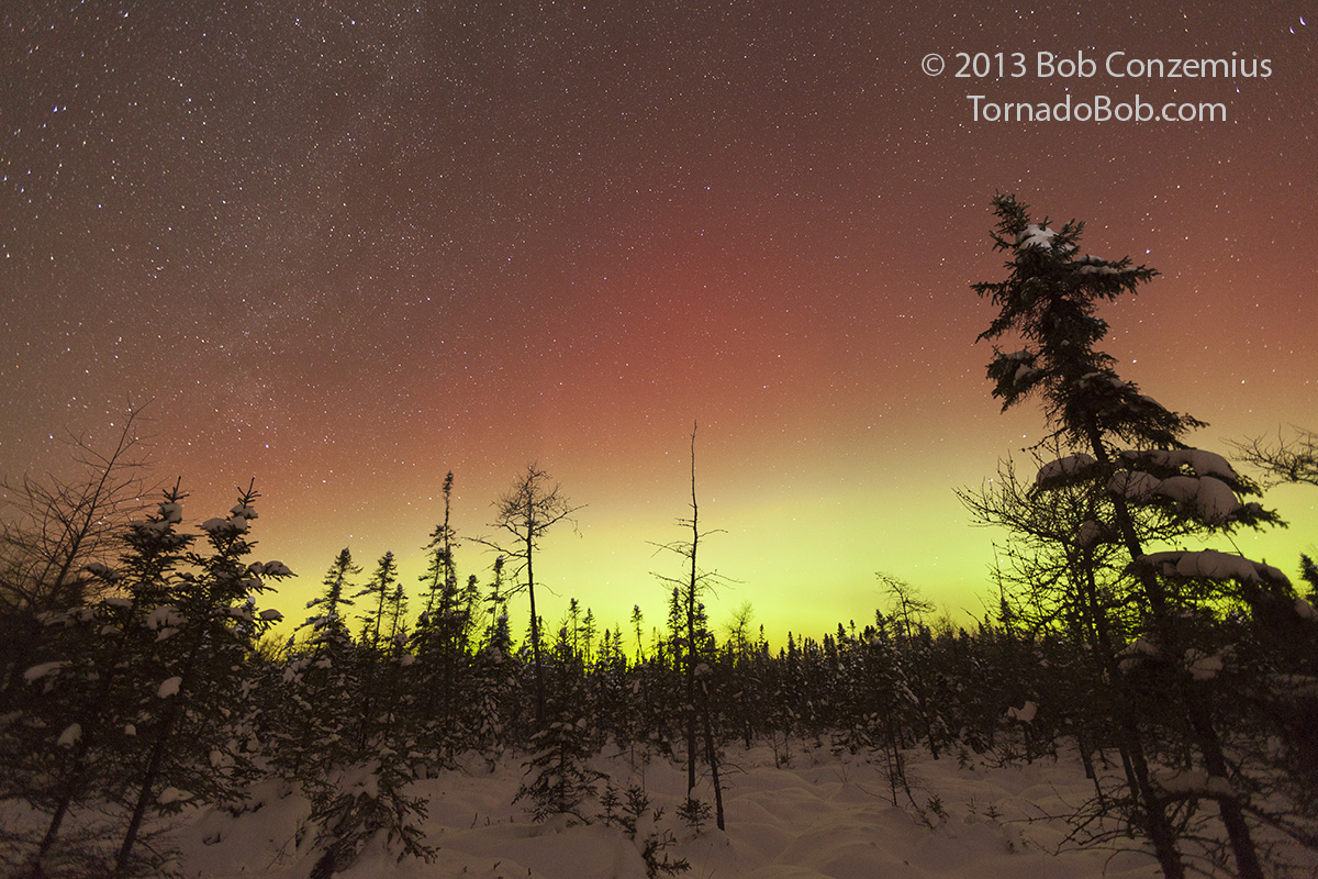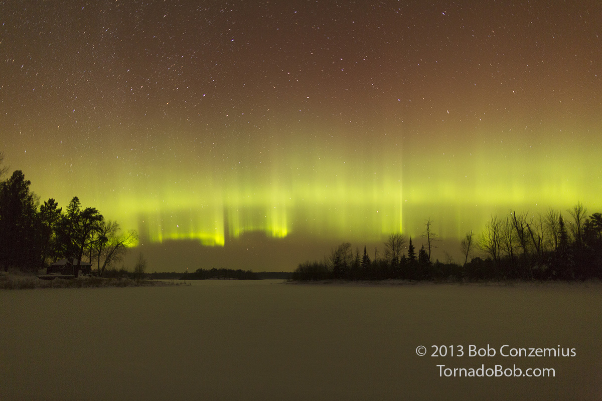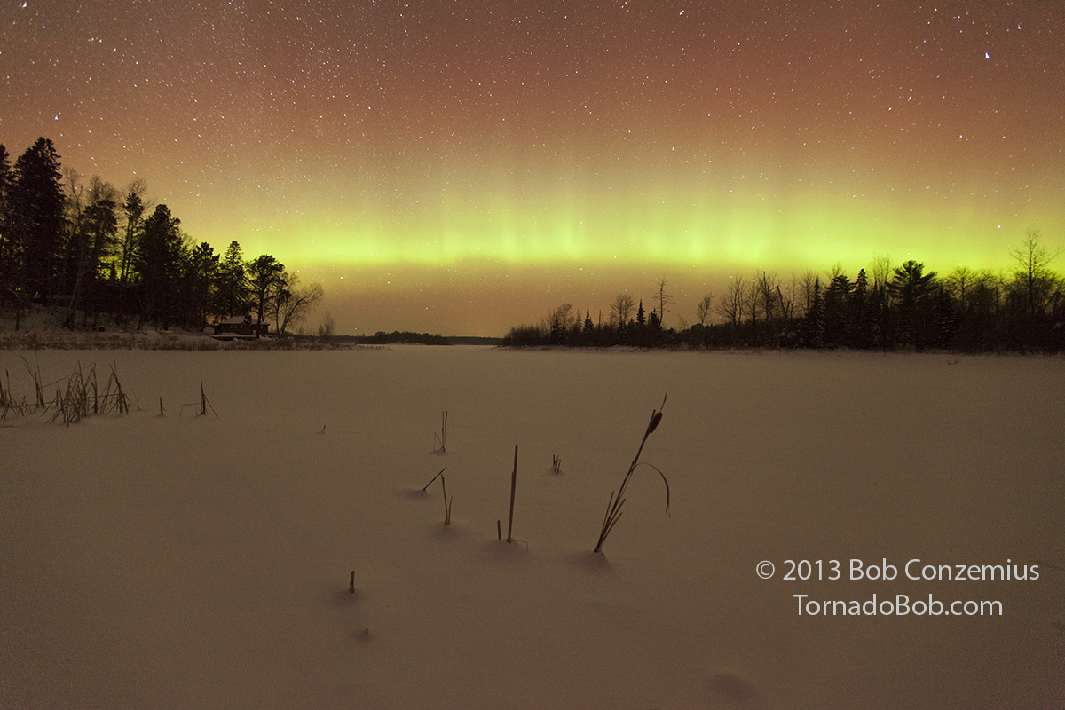 After an hour or so of shooting at Johnson Lake, one of my cameras died (cold battery). I shot a few more images with the other camera, but the auroras were starting to fade, so I called it a night. I drove home with -33 F on the car thermometer (-36 C) and managed to find -35 deg F in a bog on the north side of Grand Rapids on the way home.