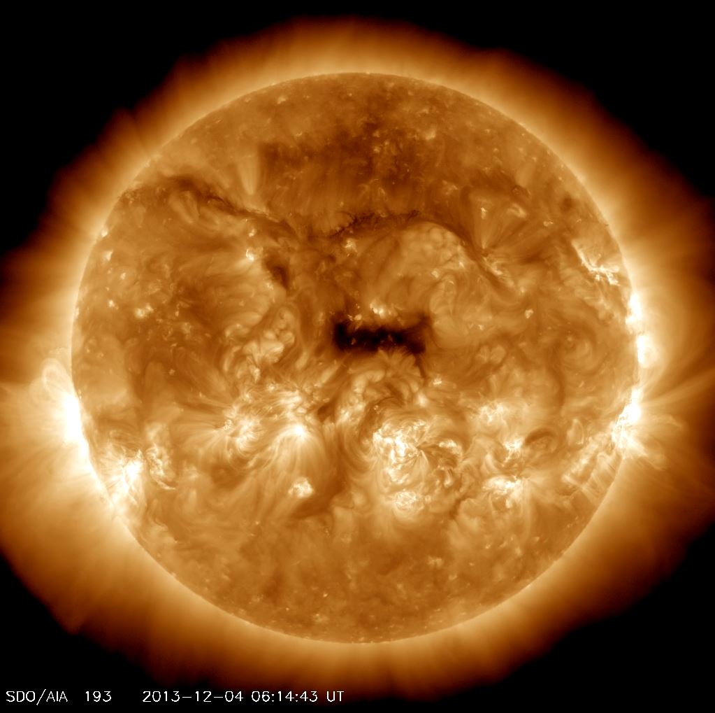 | UV image of the sun showing the coronal hole (the dark spot in the middle) a couple days earlier, when it was pointing at Earth. |