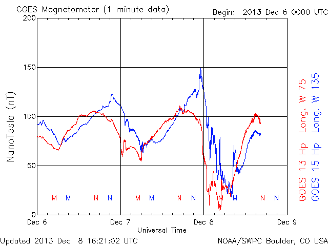 | GOES magnetometer data less than 50 nT usually means visible auroras in Minnesota. |