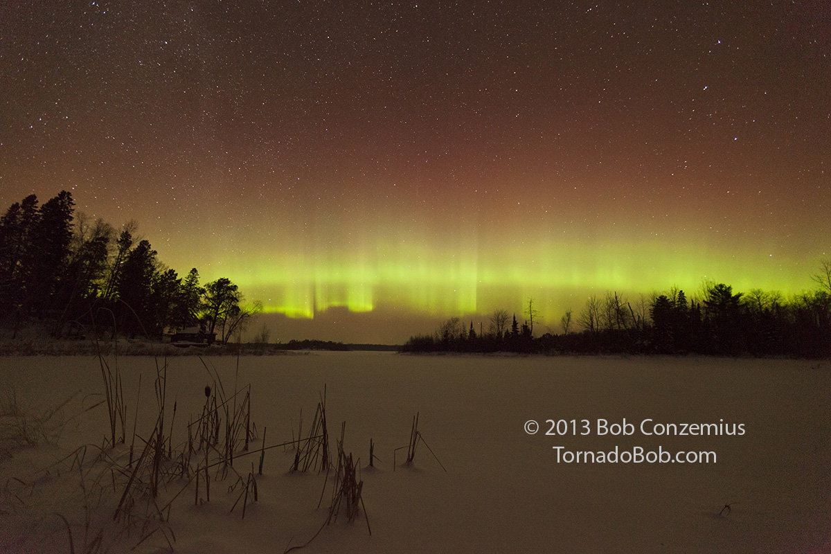 | Cattails and auroras on Johnson Lake (temperature near -30 deg F.) |