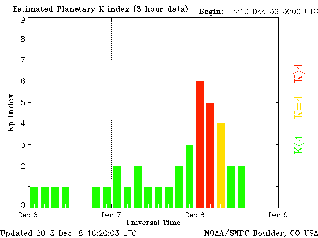 | The Kp index reached a value of 6 for this event-- a moderate (G2) geomagnetic storm. |
