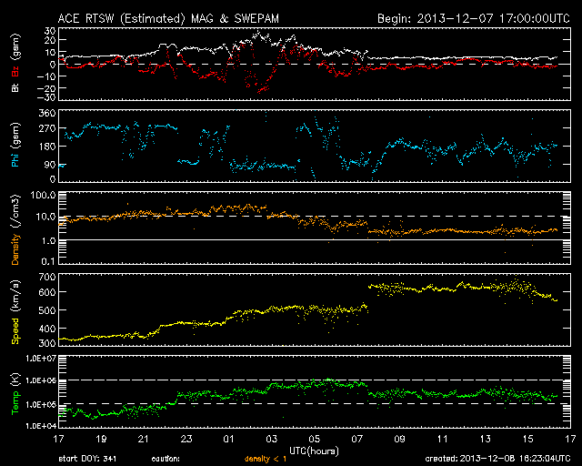 Bah, Humbug! The magnetic field was dropping south, and I was stuck at a Christmas party with my co-workers. The corotating interaction region ahead of a coronal hole high speed stream was affecting Earth, and I knew the auroras would be out shortly. I stayed as long as I could and occasionally popped my head outside to have a look to see if the auroras had appeared yet. The magnetic field was south to near -20 nT, but it was taking a while for the auroras to appear (thank goodness-- I didn't want to be a dork and leave the party too early).