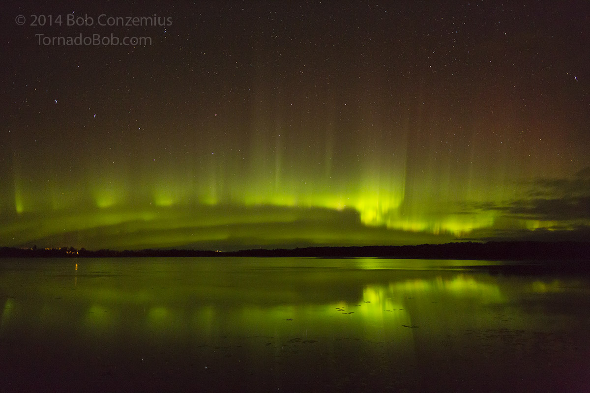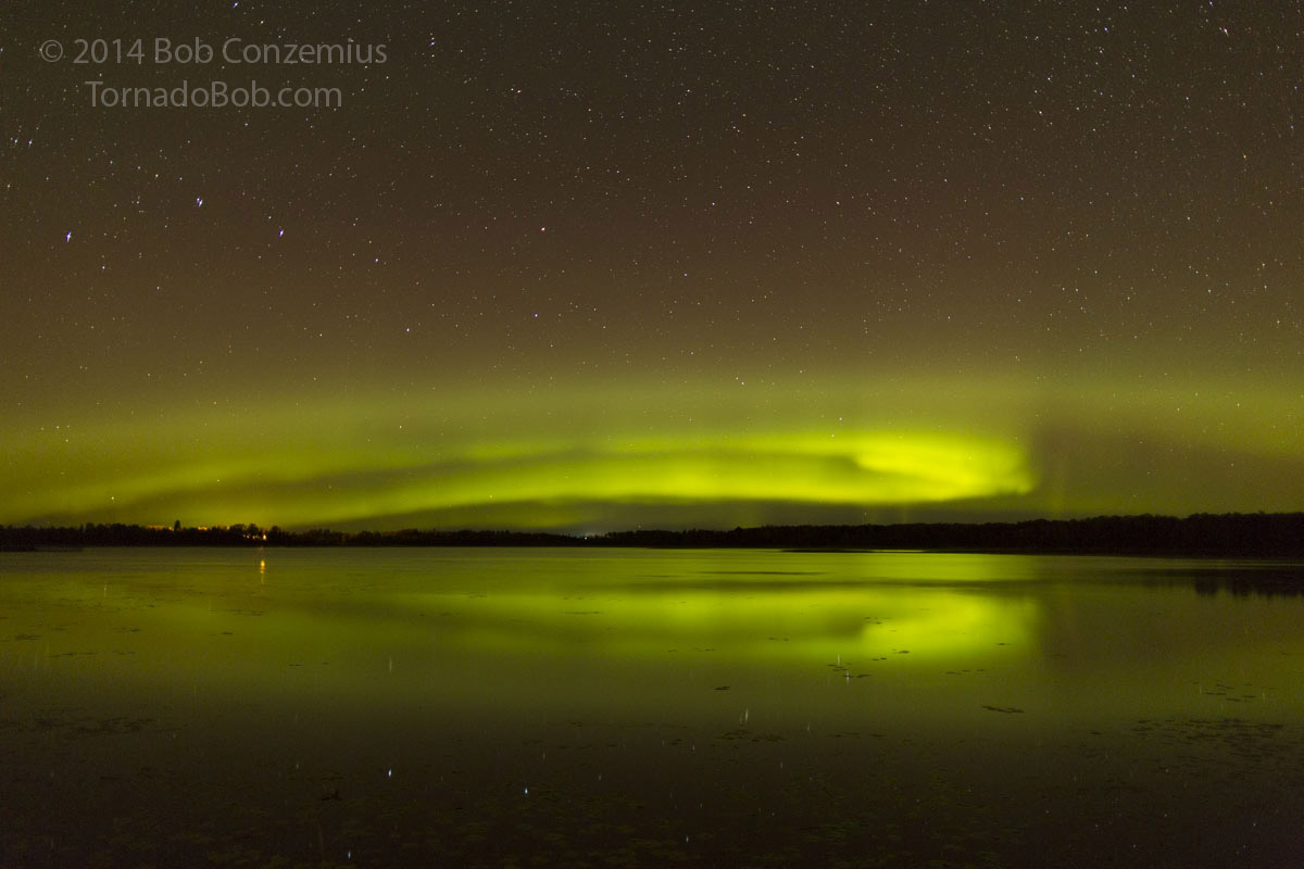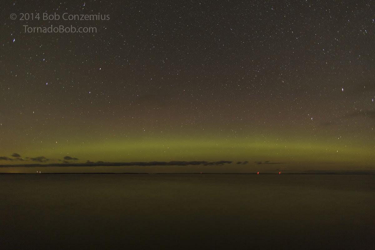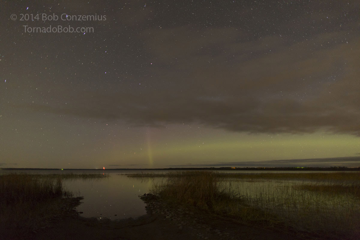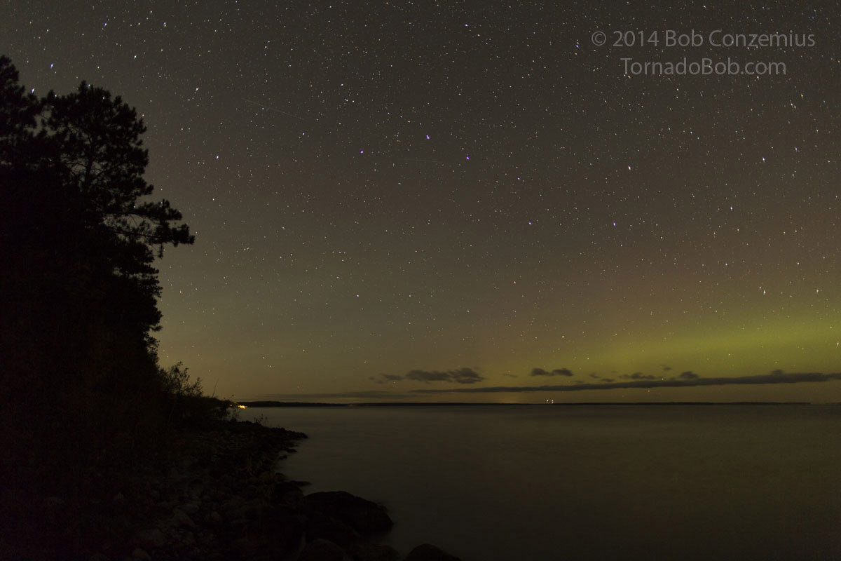 There were still a few clouds around, and I could see clear skies to the northwest, so I headed west to Bena, where a larger view over Lake Winnibigoshish would provide a better view of the entire auroral oval. I found a Forest Service boat landing that I had not visited before and found it to be more to my liking than the small beach I had found right in Bena.