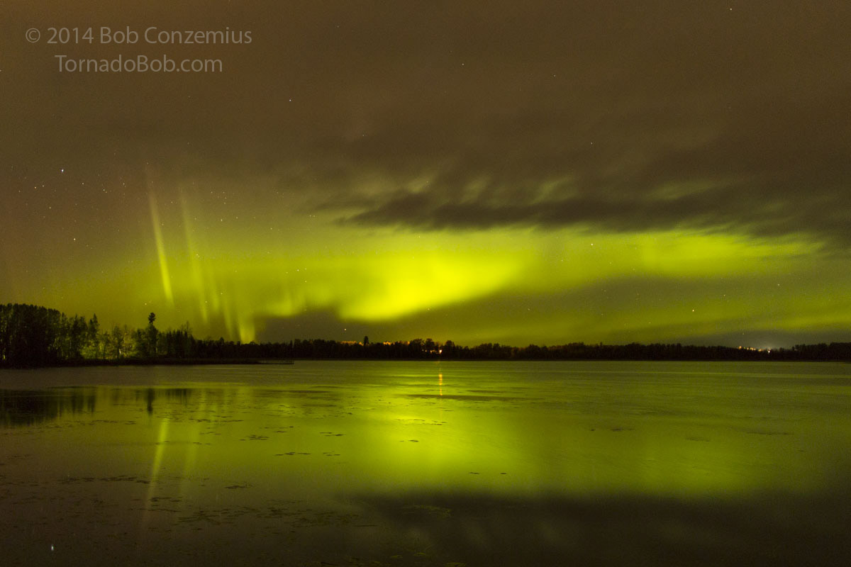 | Auroral oval and a column over Ball Club Lake. It looks like the wild rice has been harvested here. |