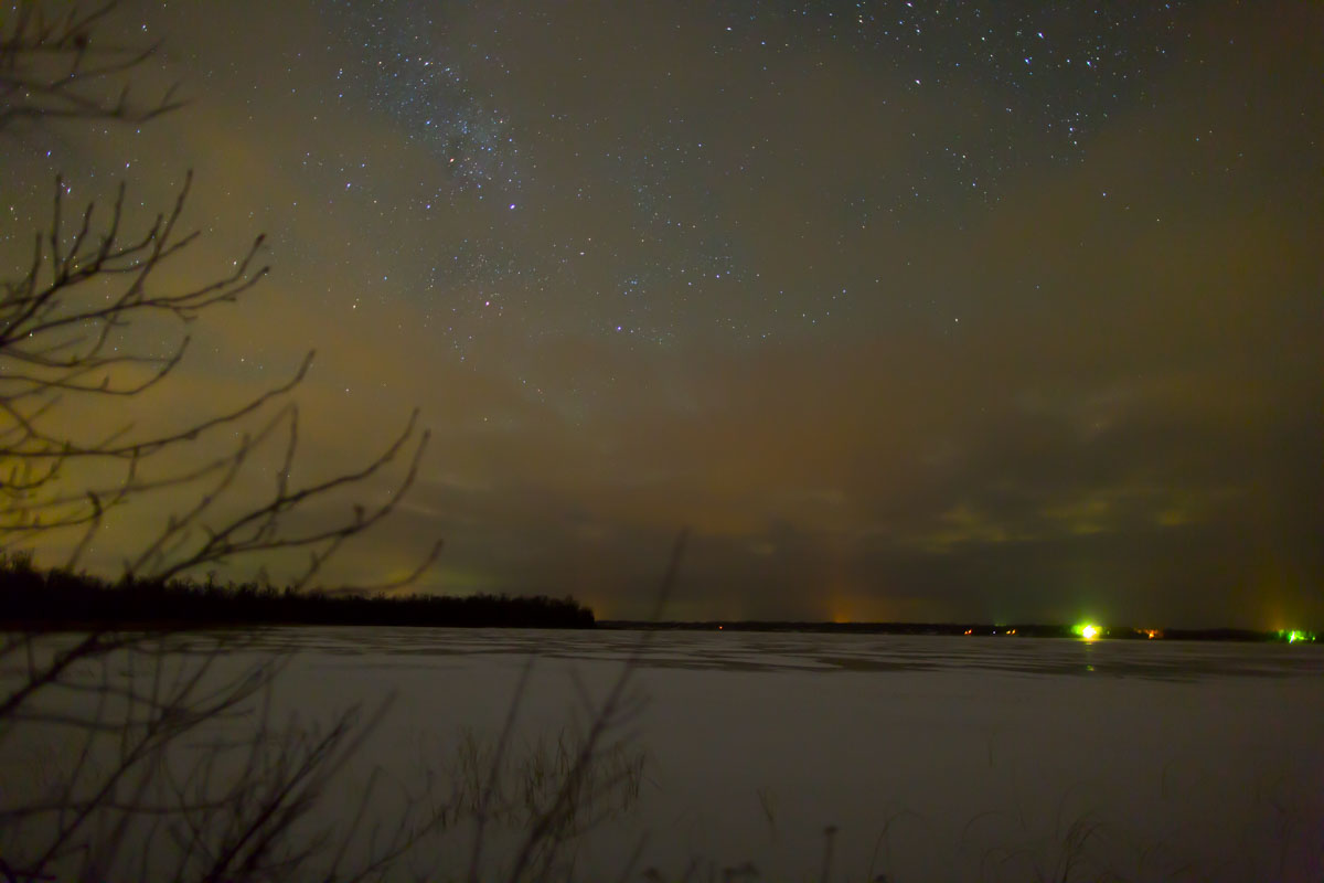 Bz tipped a bit south, so I decided to check for auroras. I headed to Pokegama Lake, and the skies were mostly clear, but there was a lot of haze, and I was looking directly north toward Grand Rapids, so I decided to head north of town. In the intervening time, scattered clouds either developed or moved back in. I drove to Moose Lake, which was already frozen, and pulled over at a parking spot to walk out on the ice and check for auroras. The clouds made it difficult to tell whether I was looking at a glow behind them or at lights underneath them illuminating the base of the clouds. It turned out I was looking at a bit of glow, so I'm posting the best shot here.