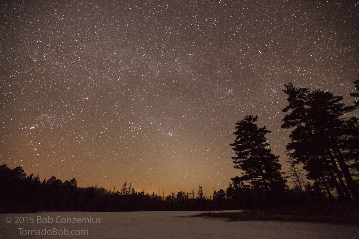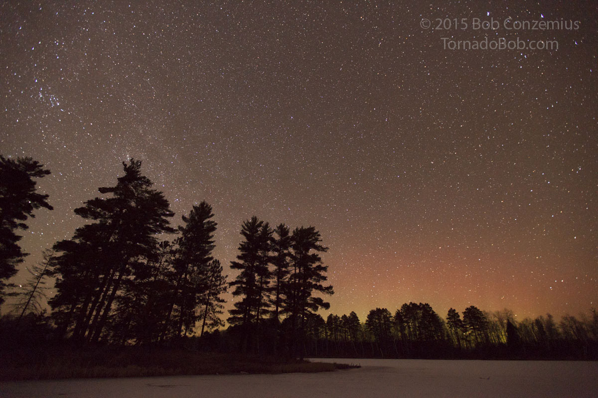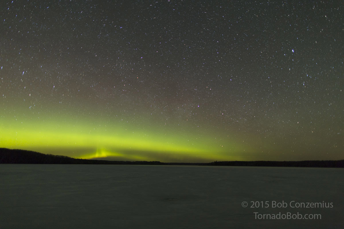 Once I had take a few shots, I got back on the trail and was on Trout Lake in a few minutes. On the way, a bright auroral band developed a bit higher in the sky than I expected because the magnetic field was really not very far south. The last bit of the hike through the woods seemed to take forever, as if the woods extended itself as I was hiking, and the lake was always another 50 yards away. Finally, I stepped onto the lake, set up my first camera, and looked for a way to set up a second camera because I had only brought one tripod on the hike.
