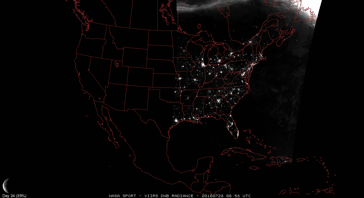 | VIIRS image at 1:58 AM. The brighter band to the north of the Great Lakes and over James bay is the aurora. |