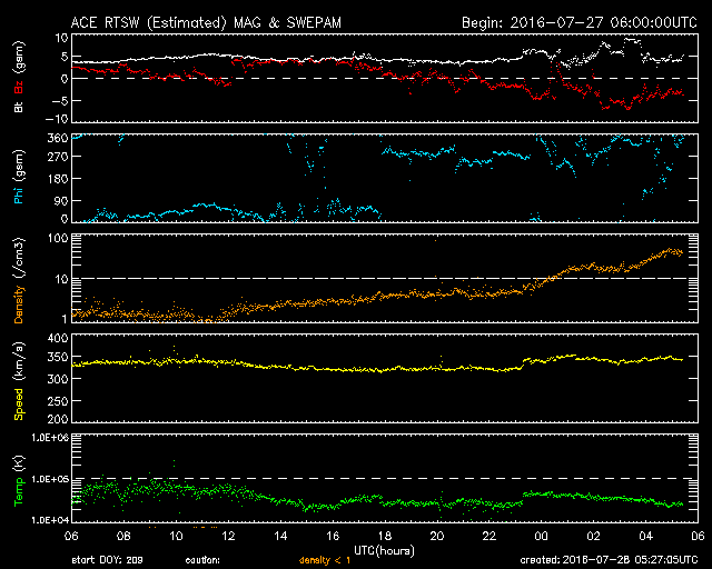 | Solar wind data from SWPC showing southward Bz and increasing density as the corotating interaction region approaches. |
