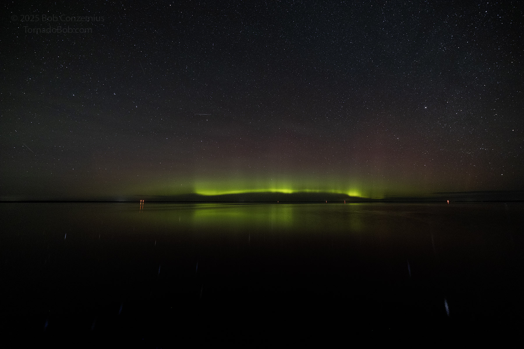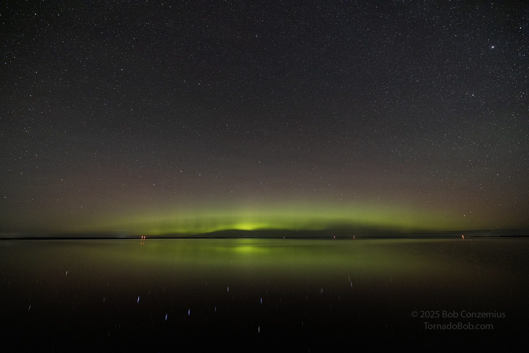 With calm winds (terrestrial, not solar), southward Bz, and clear skies, I decided to drive to Lake Winnie to catch some auroras low on the horizon.