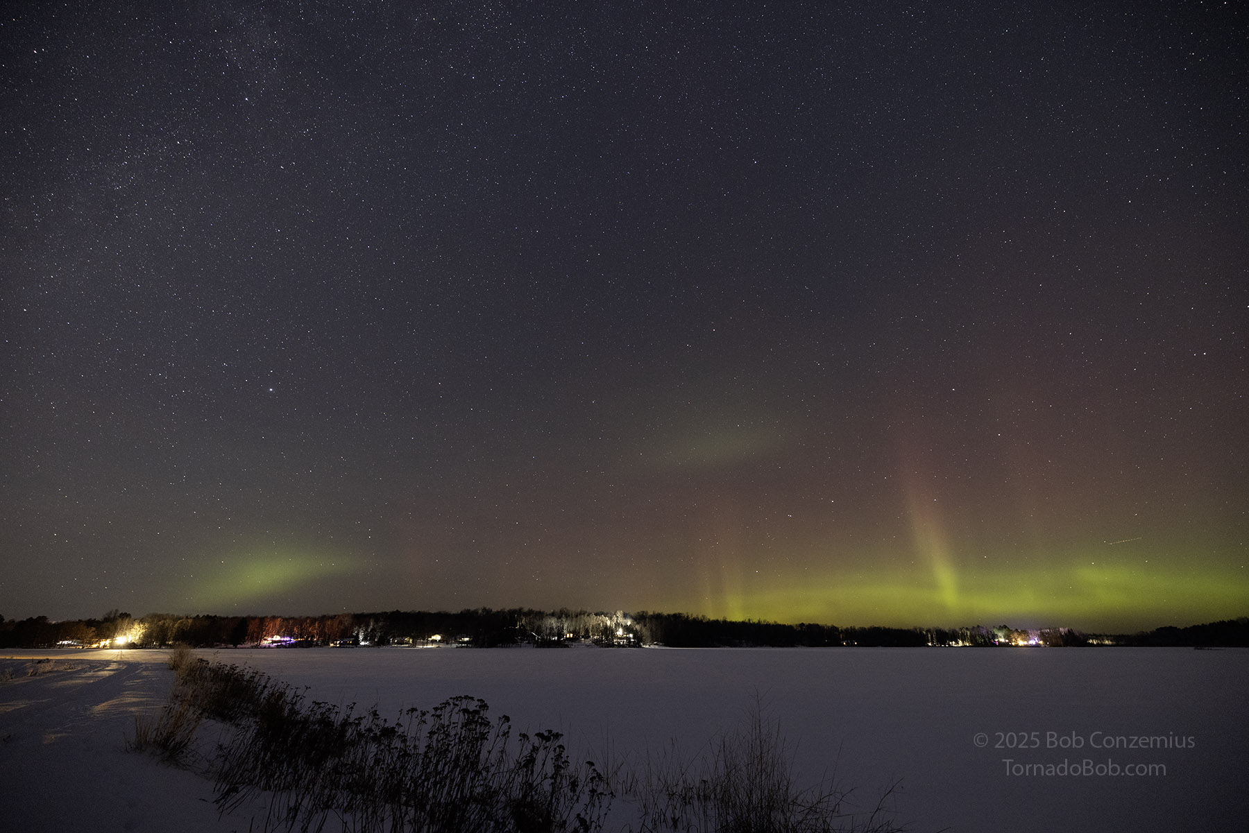 As the show was continuing, the temptation to drive up to Wabana Lake overwhelmed me. Ideally, this would have been the best place to shoot this show because of its proximity to the horizon, but I was worried the show might start before I got there (I was correct-- it did start before I would have gotten there). However, now that I knew I would not miss the show, and thinking of the small chance that another one could quickly follow (this happens only in about one out of five or ten substorms), I drove up to Wabana and walked out onto the lake. The second substorm did not follow, but I enjoyed being out on this lake for what was probably my earliest outing at this location in the winter season. Usually, I'm not out there until at least January because December auroras are the rarest in Minnesota. This December, I've seen them three times already-- that's the most of any December since I've kept track.