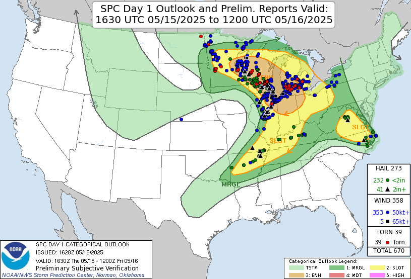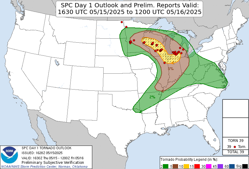 The Storm Prediction Center issued an enhanced risk of severe storms for parts of the Great Lakes region into eastern Minnesota. The risk included a 10% tornado contour, and the possibility for tornadoes of EF-2 or greater intensity.