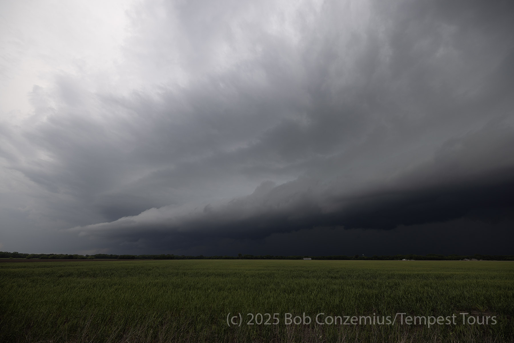 Eventually, it became clear that tornadoes in southeastern Kansas would not likely occur. There were no storms in our area, so we needed to find another target. A line of storms was developing west of the Kansas Turnpike between Wichita and Topeka. These looked like they would be outflow-dominant, but seeing linear storms would be better than seeing nothing, so we got on the Kansas Turnpike and headed toward Emporia. There, we exited and drove west on U.S. Highway 50. We quickly ran into the line and set up to take pictures. We were greeted by a nice shelf cloud and were able to spend about 15 minutes or so taking pictures as it approached. We stayed to get the whale's mouth view of the underside of the shelf cloud, and then we drove back east.
