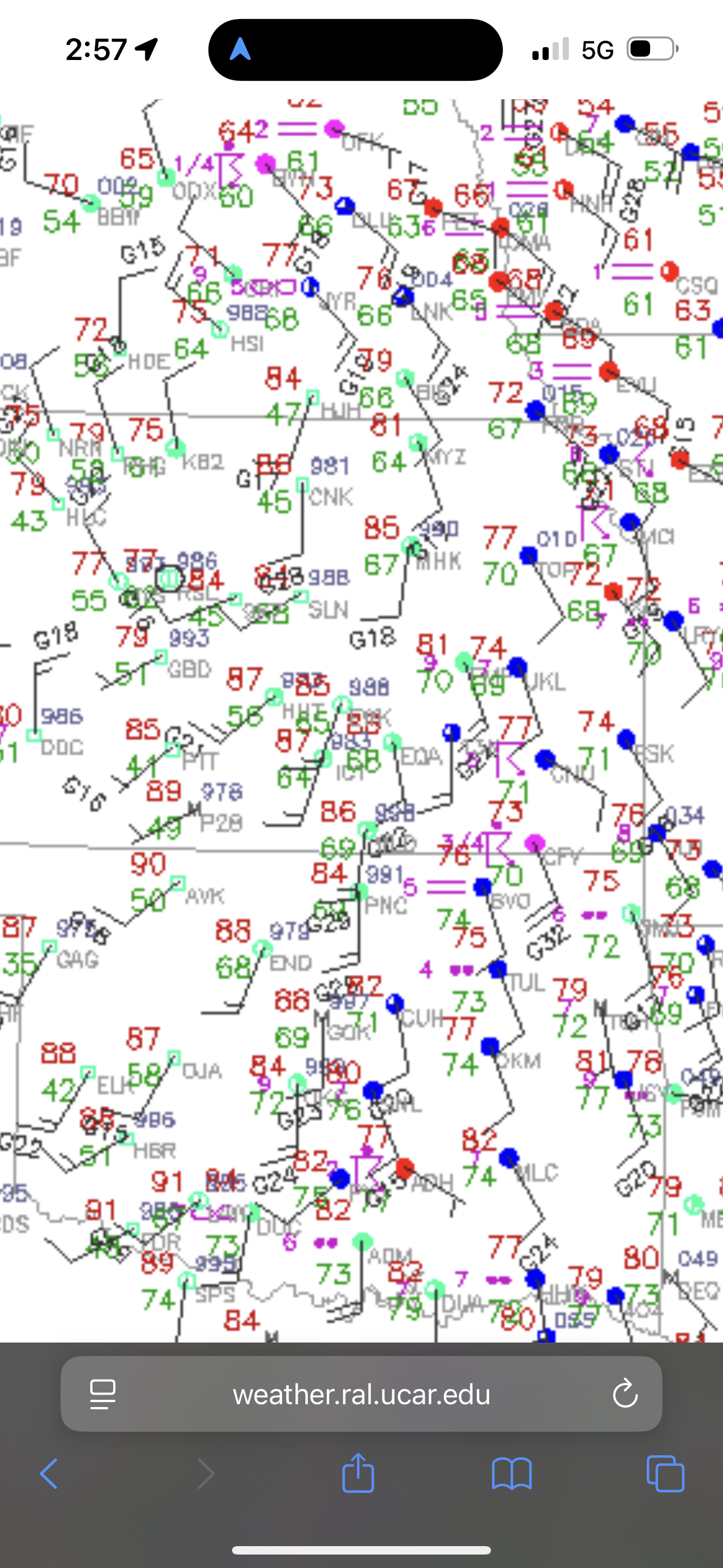 | Surface map in the afternoon. Dewpoints to the east were in the mid 70s, but we had slightly drier air. |