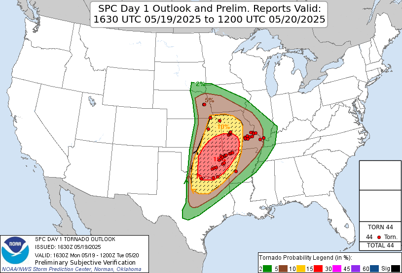 | Storm Prediction Center 1630 Day 1 tornado risk and verification. |