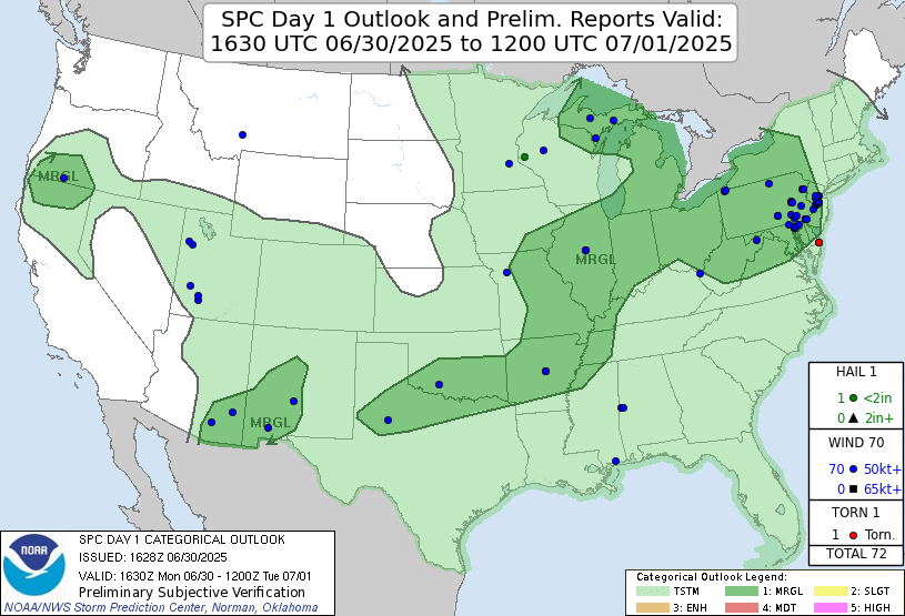 | Storm Prediction Center 1630 UTC Day 1 convective outlook with verification. |