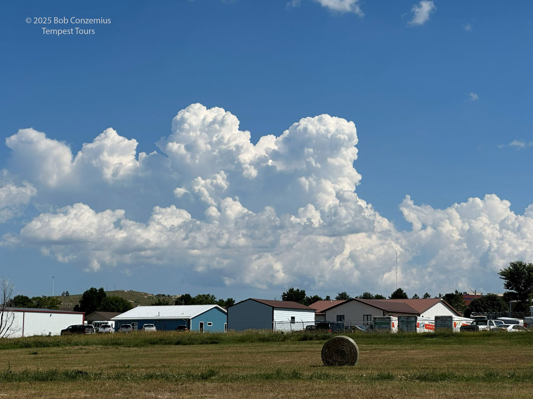 When we finished our museum visits, there still weren't any clear targets. There were some cumulus south of town, but there were also some to the north, and there were storms developing over the Black Hills (the last of these is a nearly certain bet in the summer). We drifted north in search of something that would develop into a storm, and we quickly found ourselved back in Chadron, where we had been a couple days earlier. The towering cumulus in Chadron were bigger than those farther south, but they didn't look very menacing, so we just elected to head toward the Black Hills and wait for one of those storms to come out onto the plains.