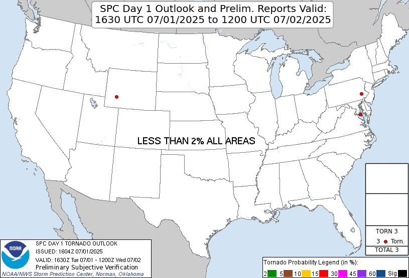 | Storm Prediction Center 1630 UTC Day 1 tornado outlook with verification. |