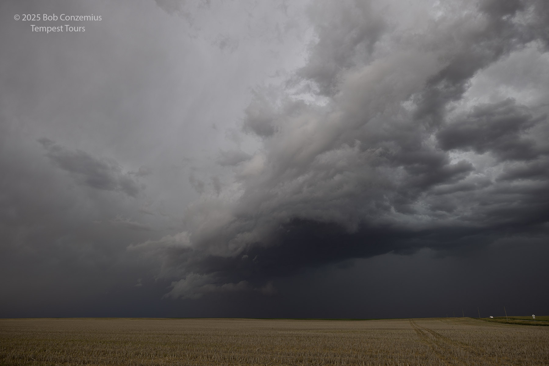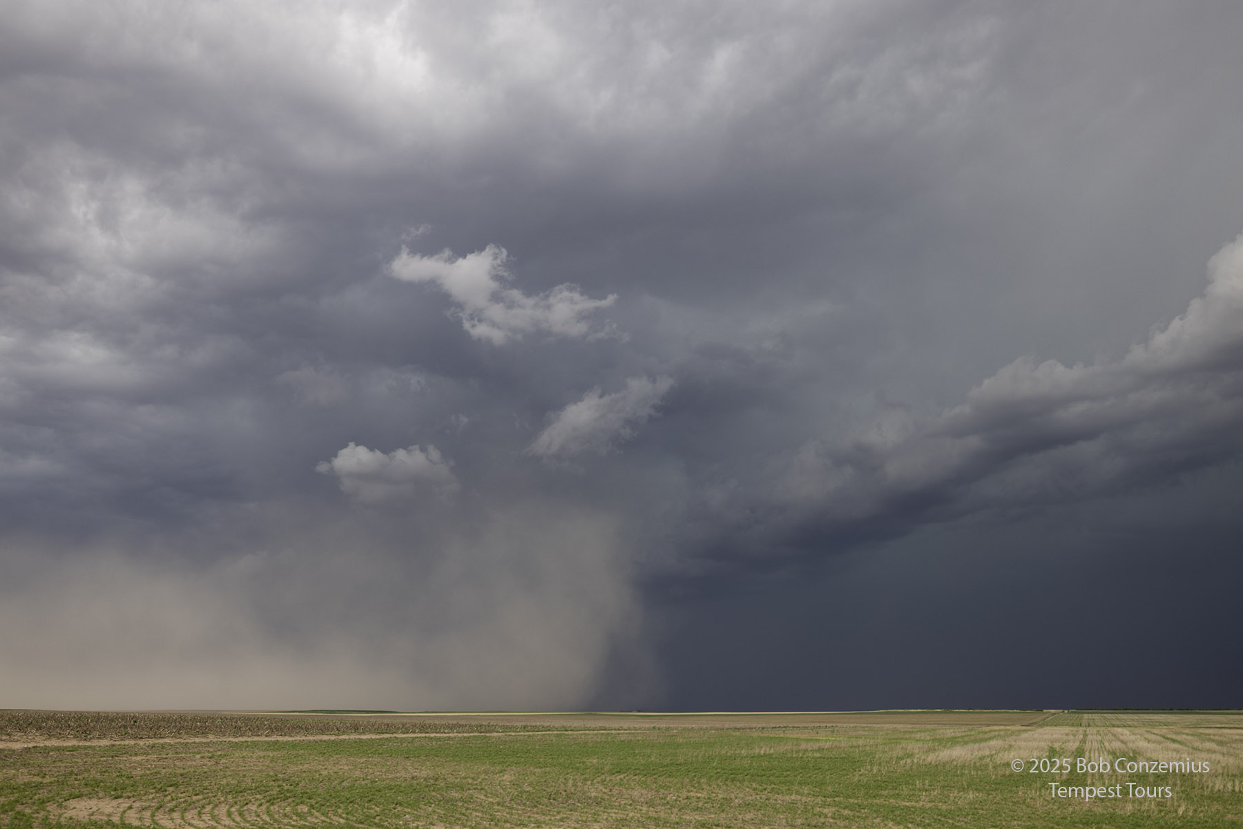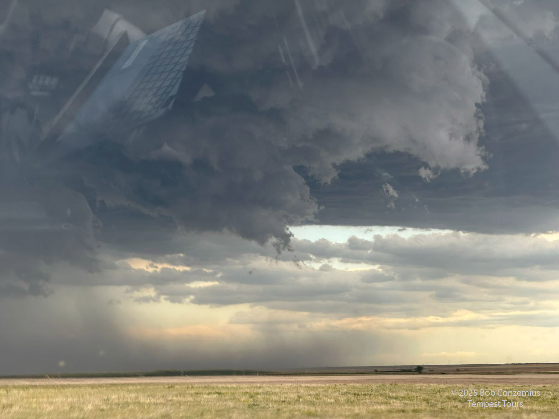 We came around the south side of the storm and got to view its inflow a bit. The RFD side of the storm had a bunch of dust, obscuring visibility into the low levels of the storm. To get a better view, we kept going east, and we eventually reached Colorado Highway 59 south of Haxtun. By this time, the cell was looking less organized, so we targeted some newer storms to our south.