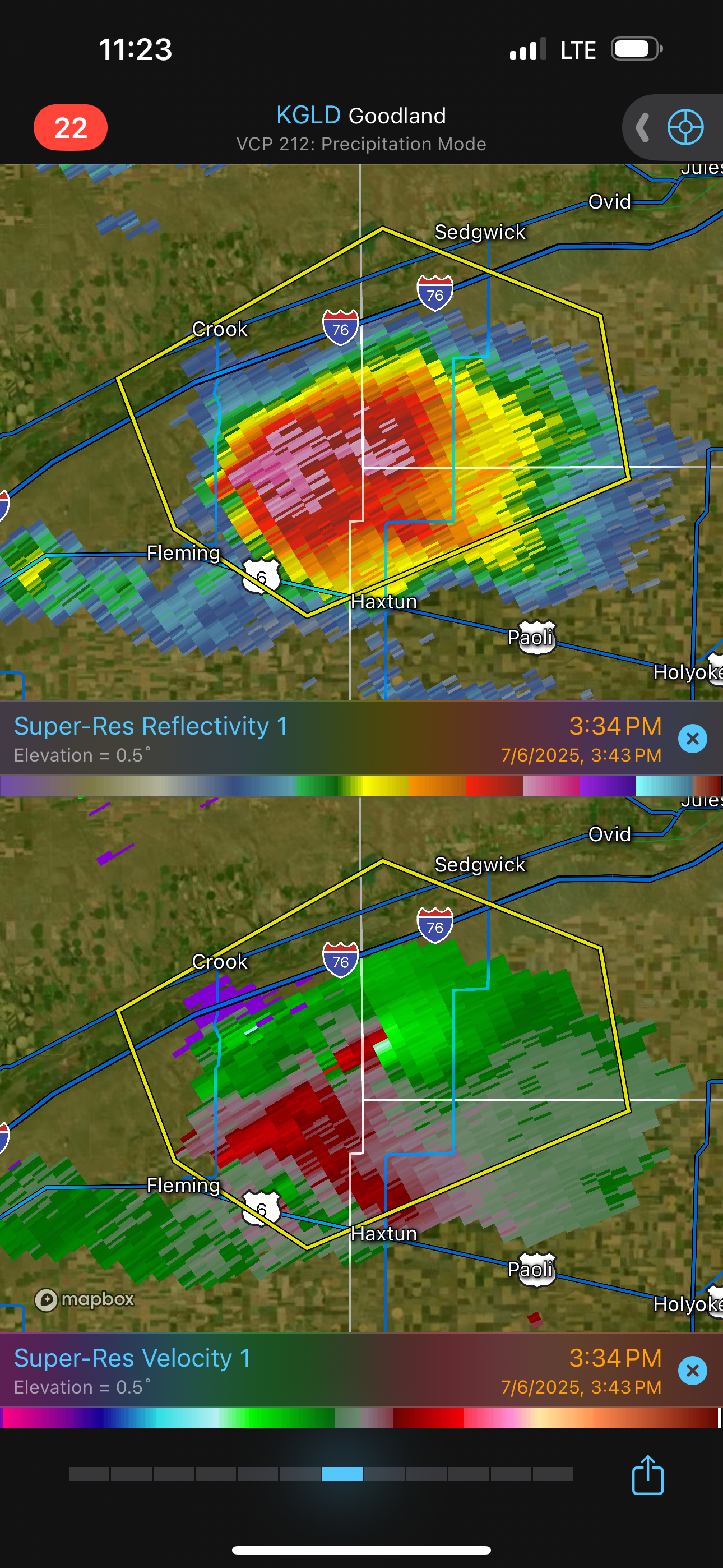 | Radar loop showing anticyclonic rotation in many of the storms. The storm we had just seen at Brush is tornado-warned. |