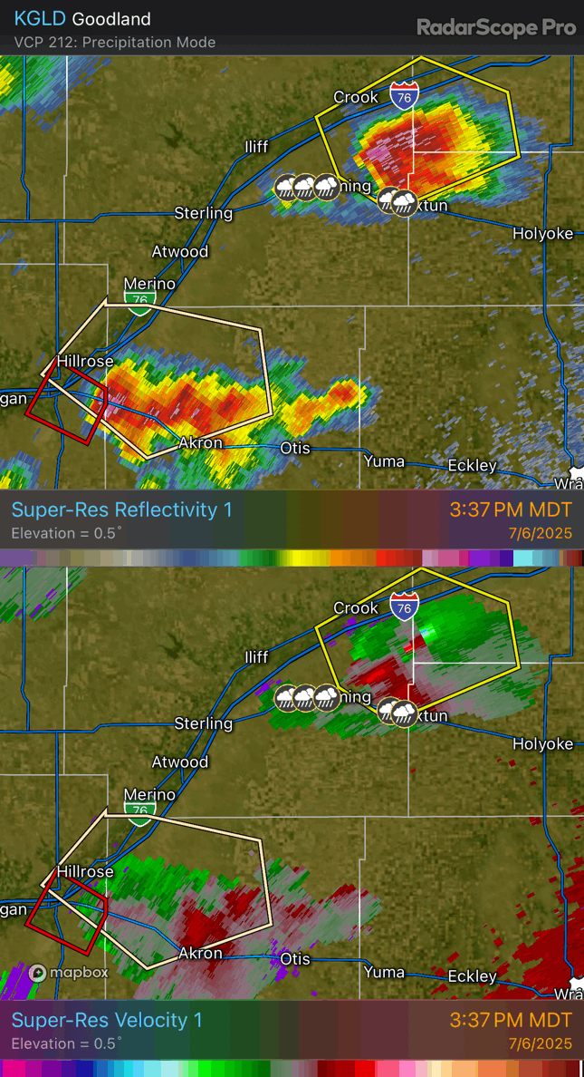 We were maybe fifteen minutes down the road, headed in the direction of Sterling, when a tornado warning was issued for the storm we had just seen at Brush. It looked photogenic but nowhere near tornadic. Well, that doesn't matter for landspouts. In this case, radar showed the rotation to be anticyclonic! This was certainly an interesting case.