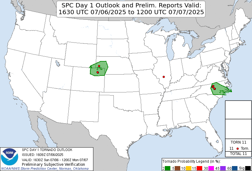 | Storm Prediction Center 1630 UTC Day 1 tornado outlook with verification. |