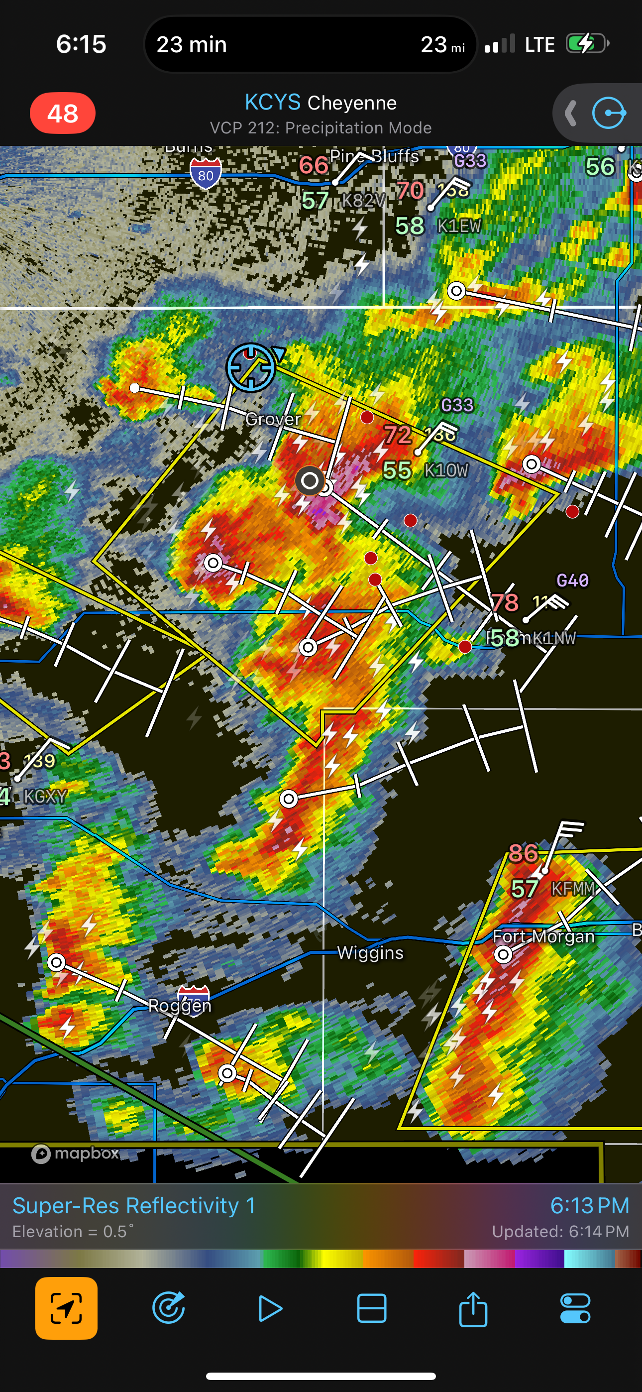 That was about all. We raced east on I-80 to get back in front. I wanted to drop south ahead of it one more time, but we missed that exit amid some construction on I-80. That ended up not being much of a problem. The storm appeared to lose some if its structure, anyway, as it got toward that mess of storms in northeastern Colorado.