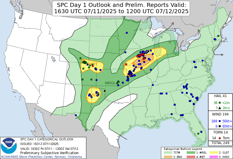 | Storm Prediction Center 1630 UTC Day 1 convective outlook with verification. |